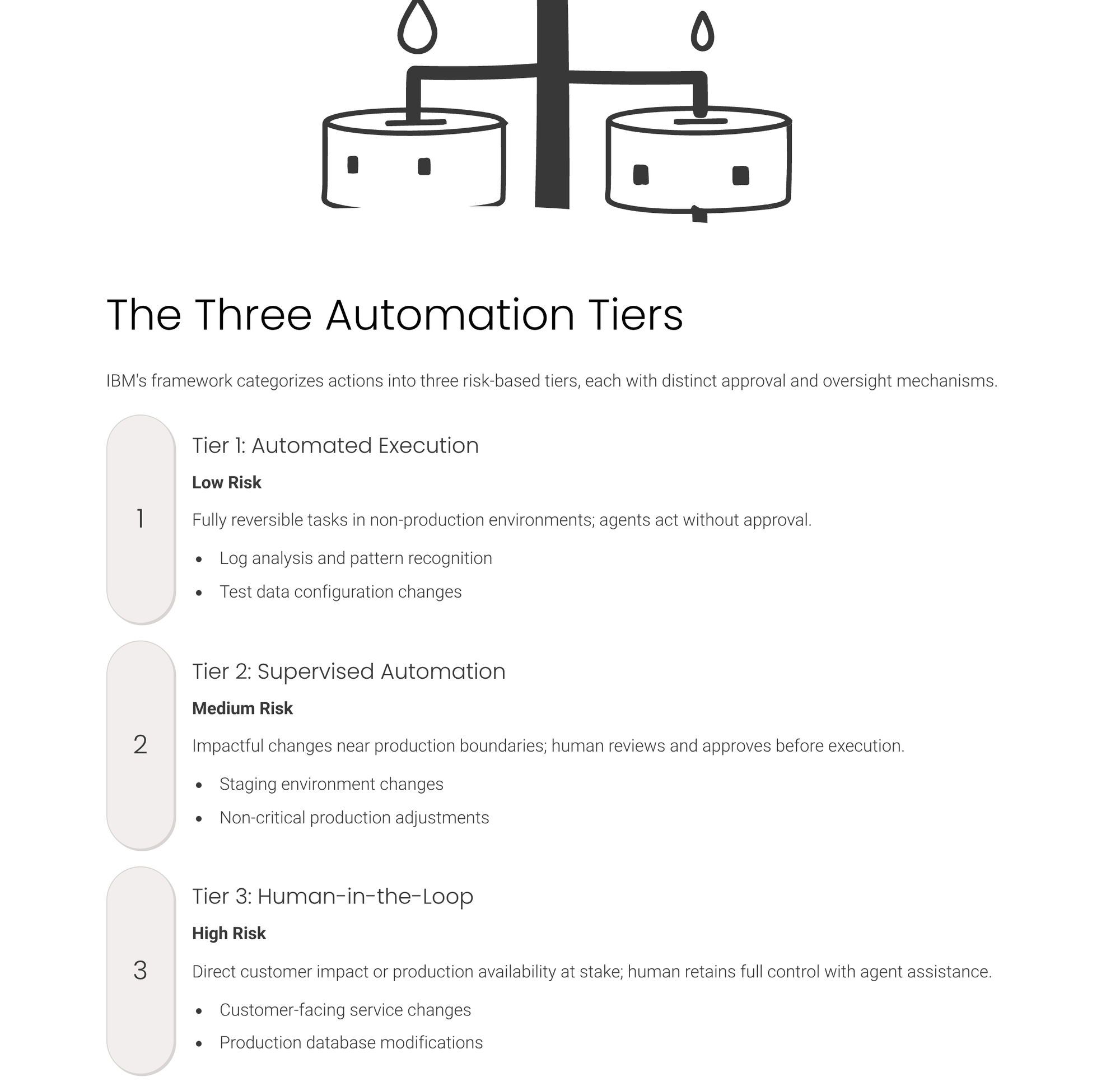 Automated execution applies to low-risk, reversible tasks where mistakes create minimal impact and corrections require minimal effort. The framework provides examples, including log analysis and test-environment operations, but does not establish formal criteria for determining whether a task qualifies as low-risk or what threshold defines "minimal effort" for reversal. This leaves teams to develop their own risk assessment methodologies, using IBM's examples as reference points rather than exhaustive specifications. The automated tier assumes continuous telemetry collection but permits agent actions to proceed without approval workflows or human checkpoints, making it suitable only for contexts where the cost of occasional errors remains acceptable and where detection systems can flag problems quickly enough to prevent cascading failures.