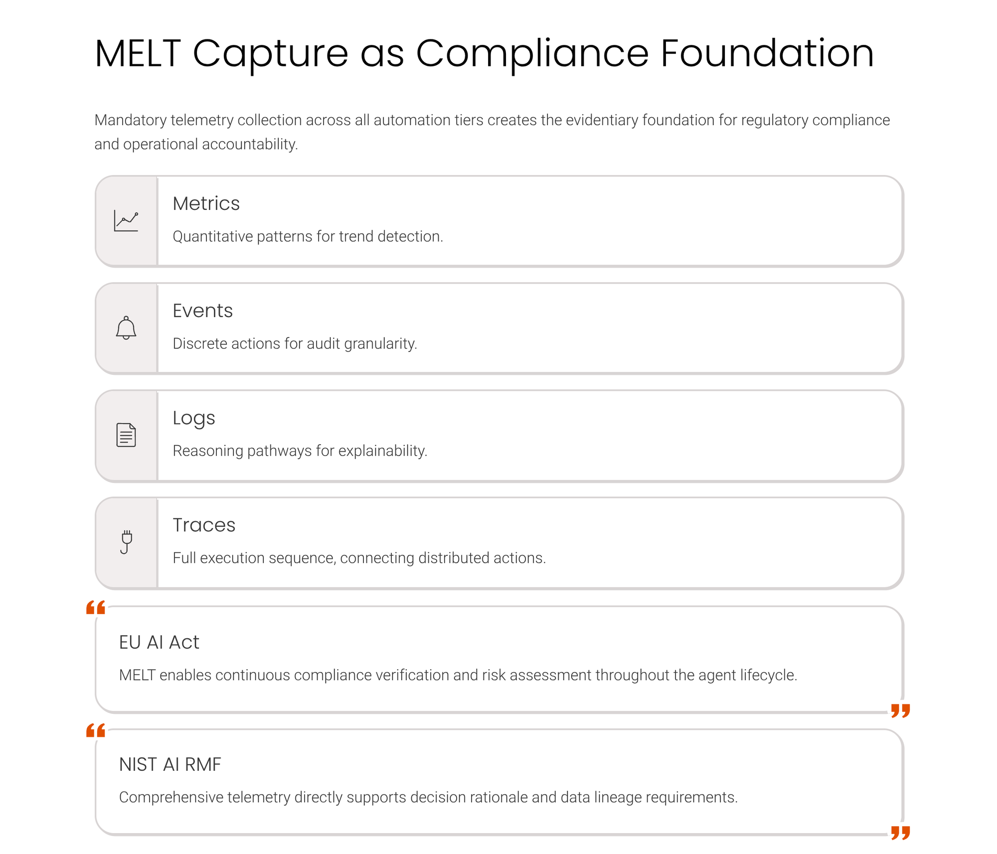 The framework mandates the collection of metrics, events, logs, and traces—collectively referred to as MELT under the EU AI Act—for every agent action, regardless of automation tier. This requirement applies to fully automated low-risk tasks, supervised medium-risk processes, and human-controlled high-risk operations, establishing telemetry capture as non-negotiable infrastructure rather than as an optional compliance add-on. MELT data serves multiple purposes that map to different accountability obligations: metrics track quantitative patterns in agent behavior over time, events capture discrete actions and state changes, logs preserve the reasoning pathway that led to each decision, and traces reconstruct the full sequence of operations from initial trigger through final execution. The EU AI Act's continuous monitoring requirements depend explicitly on MELT availability, making capture a prerequisite for operating AI systems under the regulation's scope.