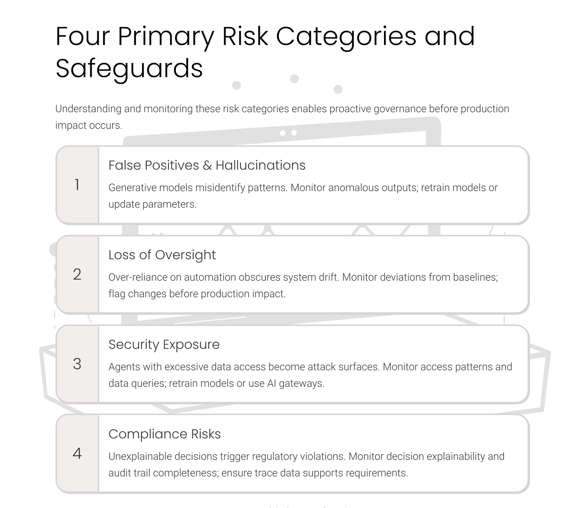 The framework identifies four primary risk categories that agentic observability systems must address through specific monitoring and control patterns. False positives and hallucinations occur when generative models misidentify patterns in telemetry data, potentially triggering unnecessary interventions or generating spurious alerts that consume human attention without cause.