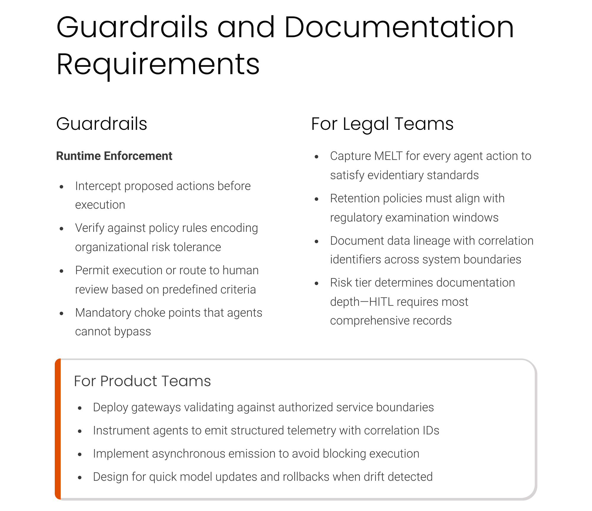 For legal teams, capture metrics, events, logs, and traces for every agent action to satisfy NIST AI RMF evidentiary standards and EU AI Act continuous monitoring requirements. MELT data provides the factual record that regulators and auditors will examine when assessing whether AI systems operate transparently and within defined bounds, making telemetry infrastructure a prerequisite for defensible compliance positions. Legal should work with engineering to ensure that retention policies for MELT data align with regulatory examination windows and litigation hold requirements, because telemetry that ages out before examination completes creates evidentiary gaps that undermine transparency claims. Documentation requirements under the framework include not just raw telemetry but also data lineage that connects agent decisions back to specific inputs, model versions, and policy rules that constrained available options. This lineage reconstruction depends on correlation identifiers that persist across system boundaries and that remain queryable throughout retention periods, technical requirements that legal should verify during architecture review rather than discovering gaps after deployment.