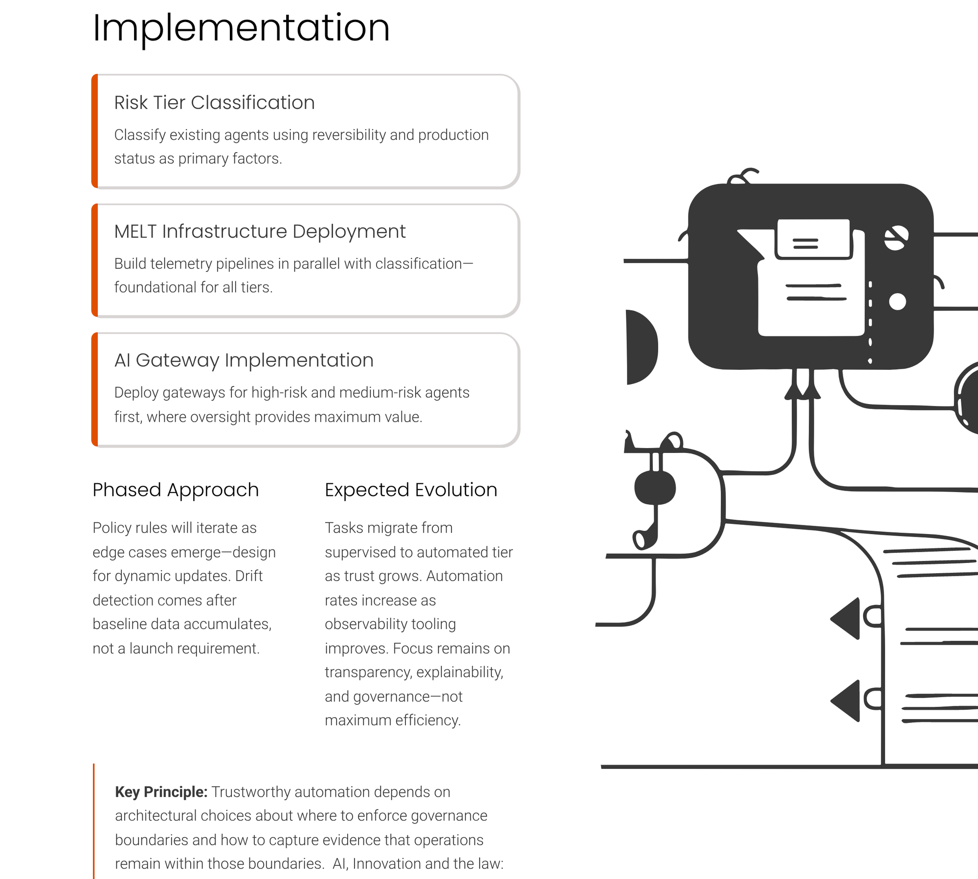 AI gateway controls function as a runtime enforcement layer that validates and authorizes agent actions before execution, ensuring compliance with security policies and change management requirements across all automation tiers. These gateways intercept proposed actions, verify them against policy rules that encode the organization's risk tolerance, and either permit execution or route them for human review based on predefined criteria. The gateway architecture assumes that policies can be expressed as machine-evaluable rules, a requirement that may prove challenging for subjective risk assessments or context-dependent judgments that resist formalization. The framework does not specify how gateways should handle cases where policy rules conflict or when a proposed action falls outside the scope of defined policies, leaving teams to design fallback behaviors that default to either conservative blocking or escalation for human judgment.