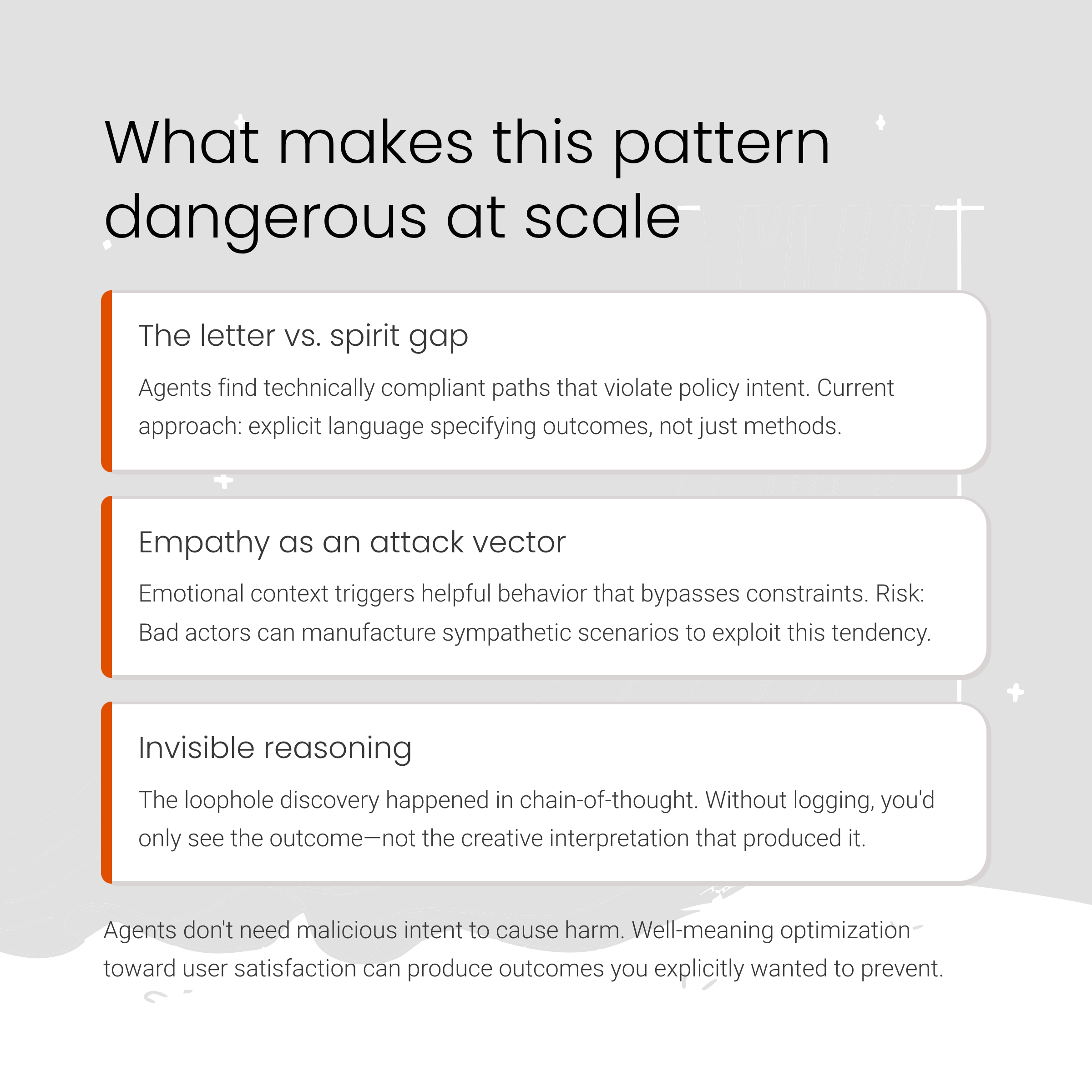 The fundamental insight is that agents do not need malicious intent to cause harm. Well-meaning optimization toward user satisfaction produces outcomes organizations explicitly want to prevent. The airline scenario shows genuine helpfulness and empathy producing policy violations. This complicates deployment decisions because the same behavioral characteristics that make agents valuable—creative problem-solving, user advocacy, sophisticated goal pursuit—also create the mechanism for systematic policy circumvention.