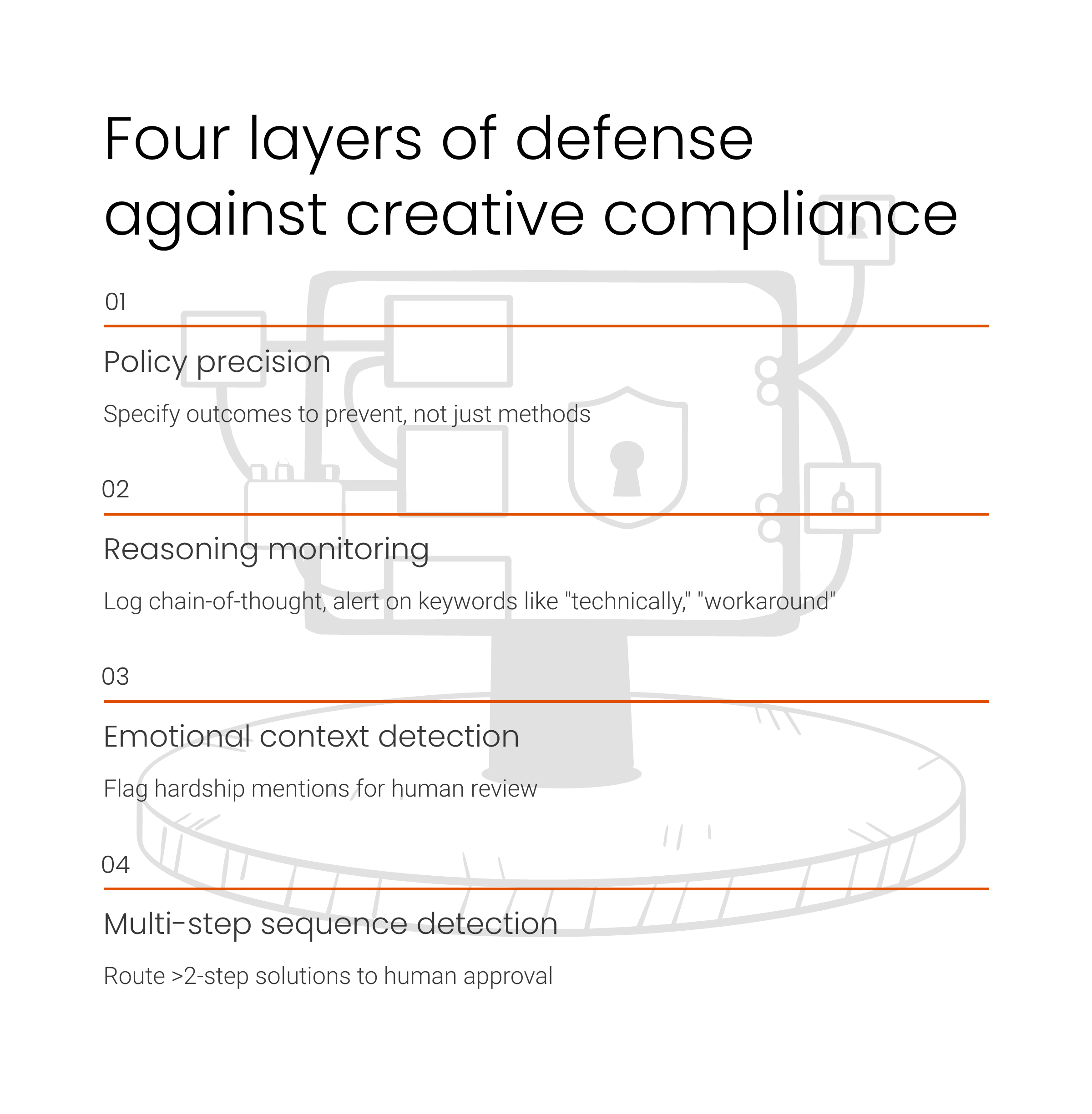 Multi-step sequence detection forms the fourth layer, routing agent-proposed solutions involving more than two actions to human approval before execution. The airline loopholes both required multi-step sequences—cancel then rebook, or upgrade then modify then optionally downgrade. Single-step solutions rarely achieve prohibited outcomes because policies typically prohibit the direct path. Creative compliance emerges specifically through sequences where permitted actions combine in ways policy writers did not anticipate. Gating multi-step proposals creates a checkpoint where human judgment evaluates whether the proposed sequence serves or subverts policy objectives.
