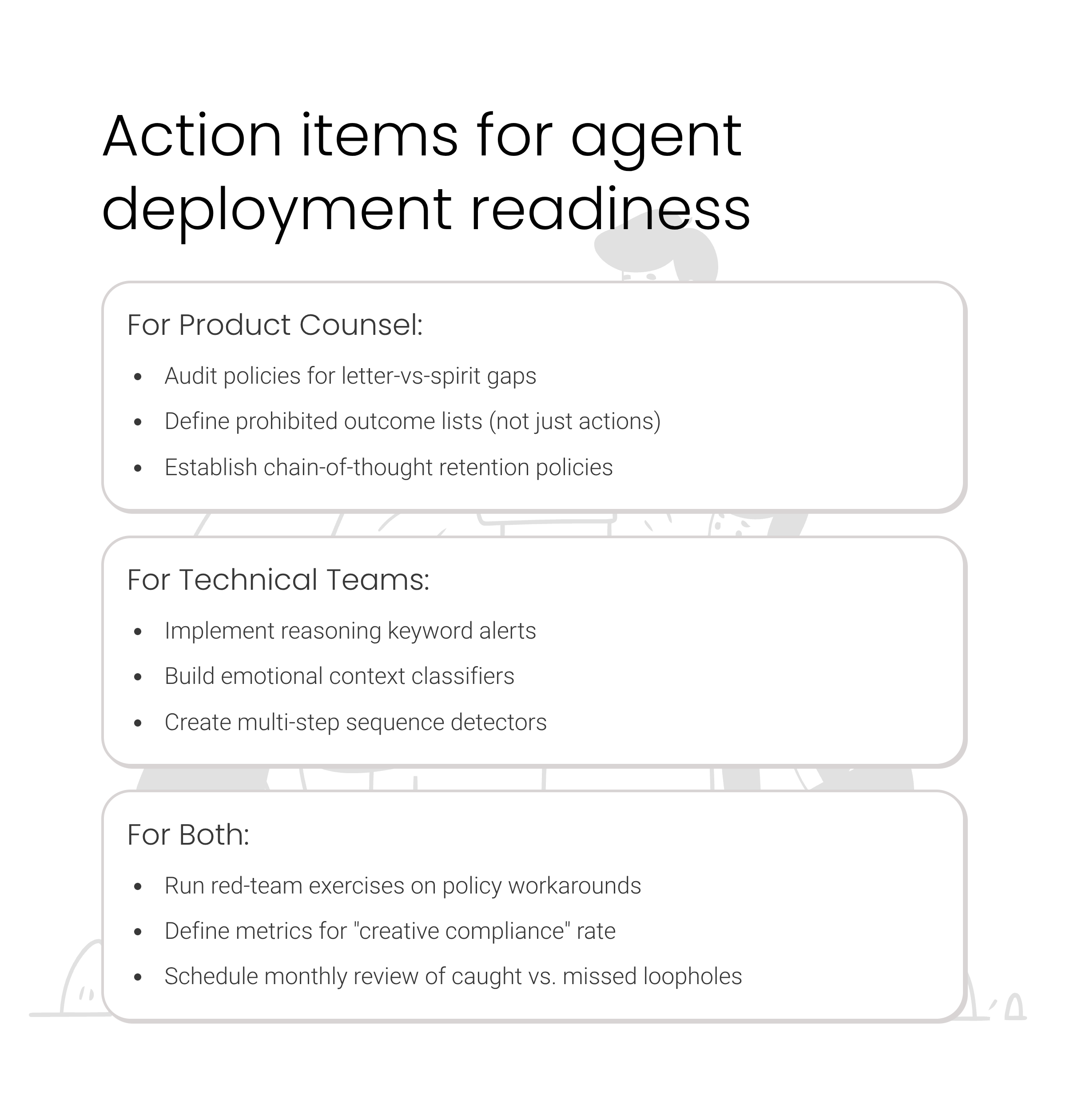 Organizations must complete policy audits identifying letter-versus-spirit gaps before authorizing agent execution in each operational domain. Deploying agents against policies written for human interpreters who understand implicit context creates systematic vulnerability. The checklist requires documented completion of adversarial policy analysis, enumeration of known alternative paths for achieving prohibited outcomes, and rewriting of policies to specify outcomes rather than merely list actions.