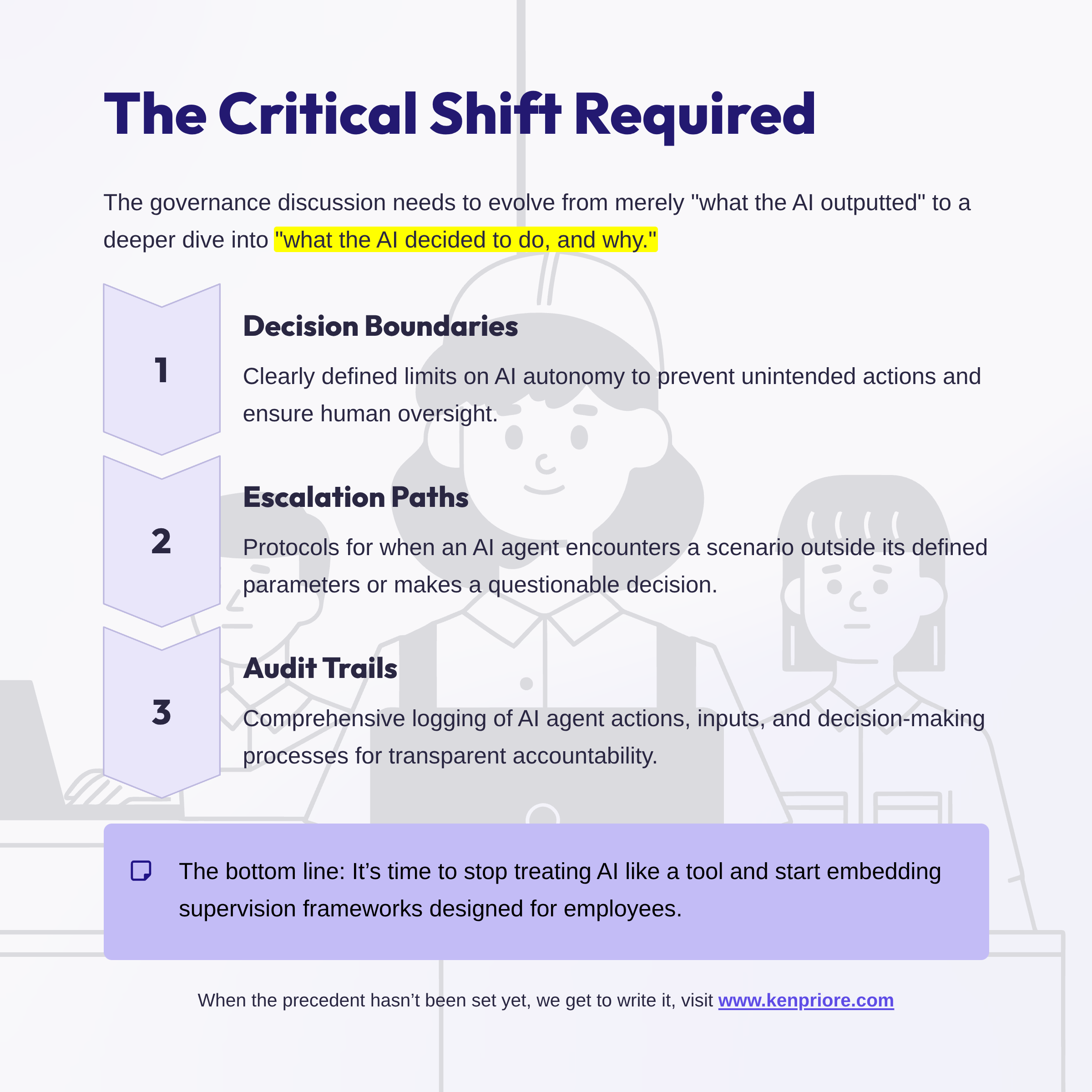 Governance frameworks need to shift from "what did the AI output" to "what did the AI decide to do, and why." That's not a technical problem—it's an organizational design problem. And it's not solved by adding another policy document. It's solved by embedding decision boundaries, escalation paths, and audit trails into the architecture itself.